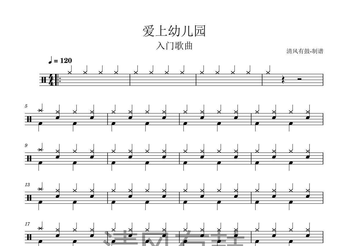 《爱上幼儿园》是张庭演唱的一首歌曲,拍号为4/4拍,歌曲速度为每分钟120拍,这份鼓谱共有两张高清图谱,图谱由 @王远康 编配上传,图谱使用五线谱编配,使用这份爱上幼儿园架子鼓谱,你将能够轻松地敲打出这首张庭的爱上幼儿园,快来尝试吧。