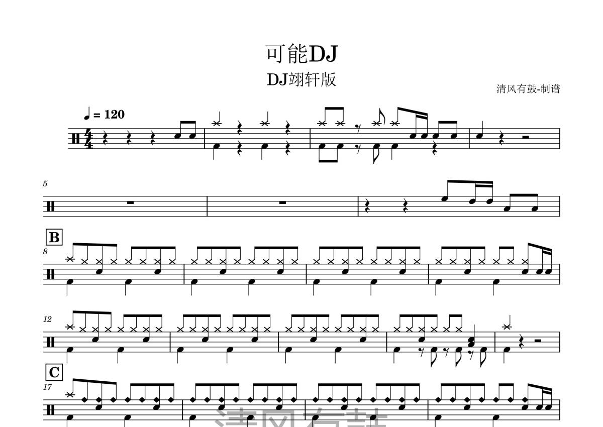 《可能》是程响演唱的一首歌曲,DJ翊轩版,拍号为4/4拍,歌曲速度为每分钟120拍,这份鼓谱共有三张高清图谱,图谱由 @王远康 编配上传,图谱使用五线谱编配,使用这份可能架子鼓谱,你将能够轻松地敲打出这首程响的可能,快来尝试吧。