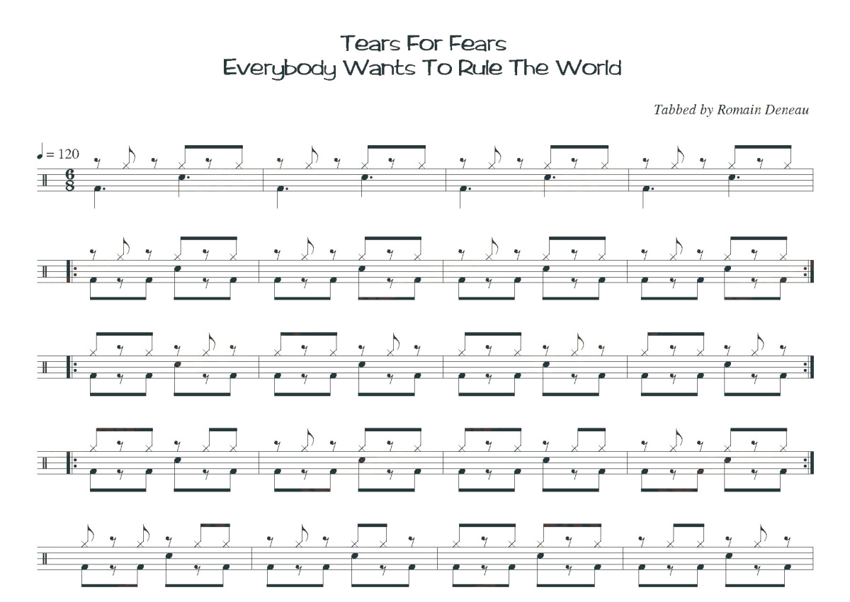《Everybody Wants To Rule The World》是Tears For Fears演唱的一首歌曲,这份鼓谱共有一张高清图谱,图谱由 @打鼓谱 编配上传,图谱使用五线谱编配,使用这份Everybody Wants To Rule The World架子鼓谱,你将能够轻松地敲打出这首Tears For Fears的Everybody Wants To Rule The World,快来尝试吧。《Everybody Wants To Rule The World》属于TEARS FOR FEARS的专辑《Songs From The Big Chair》,其在在全球主要排行榜上都曾先后登上榜首。2015年电影《像素大战》中曾出现爵士版本演唱片段。Tears For Fears是英国College Rock(学院摇滚)、New Wave(新浪潮)、Pop/Rock(流行/摇滚)等风格的一支乐队,组建时间在1981年。