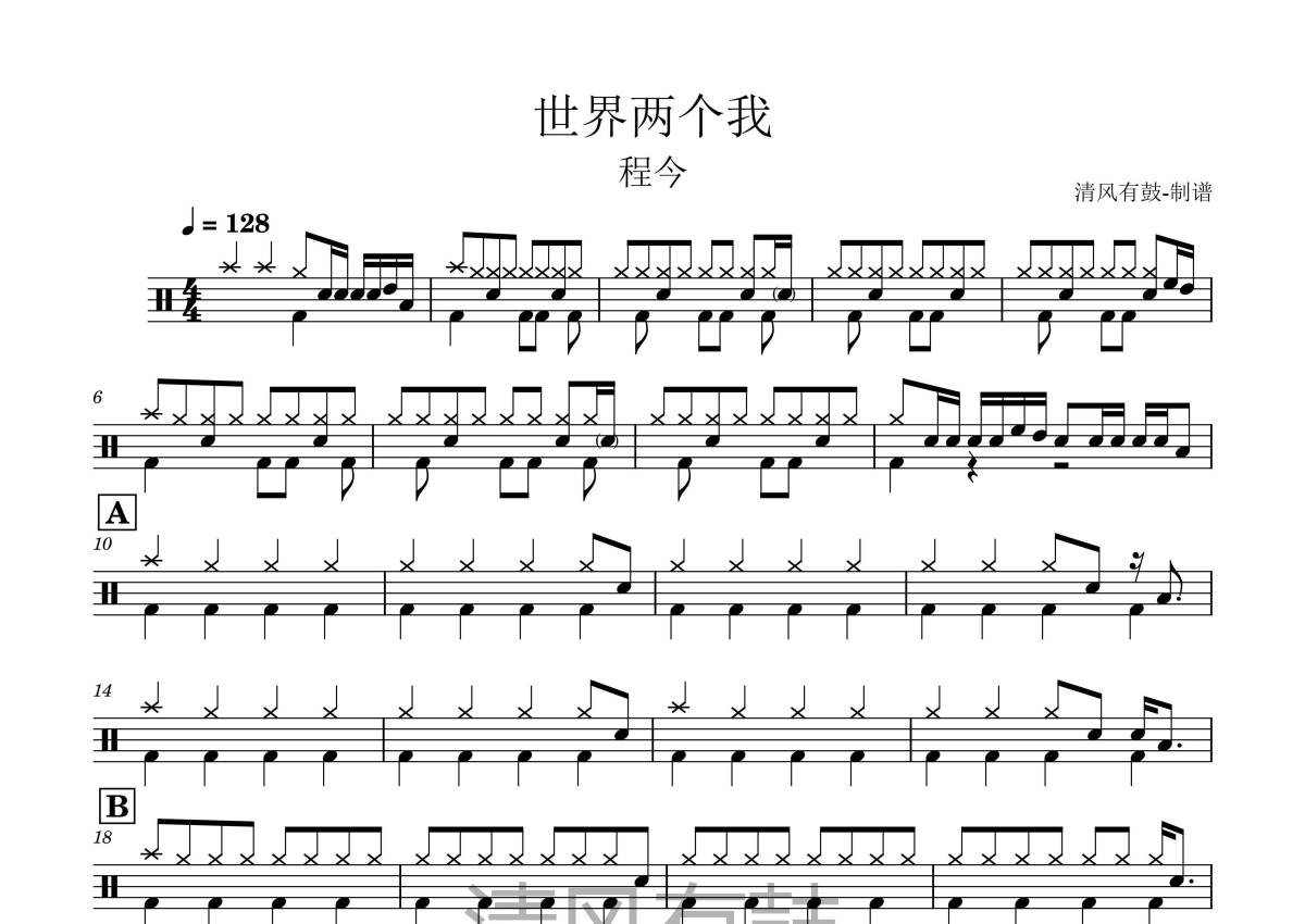 《世界两个我》是程今演唱的一首歌曲,拍号为4/4拍,歌曲速度为每分钟128拍,这份鼓谱共有三张高清图谱,图谱由 @王远康 编配上传,图谱使用五线谱编配,使用这份世界两个我架子鼓谱,你将能够轻松地敲打出这首程今的世界两个我,快来尝试吧。
