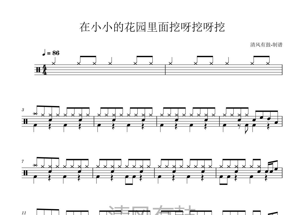 《在小小的花园里面挖呀挖呀挖》是黄老师演唱的一首歌曲,拍号为4/4拍,歌曲速度为每分钟86拍,这份鼓谱共有一张高清图谱,图谱由 @王远康 编配上传,图谱使用五线谱编配,使用这份在小小的花园里面挖呀挖呀挖架子鼓谱,你将能够轻松地敲打出这首黄老师的在小小的花园里面挖呀挖呀挖,快来尝试吧。