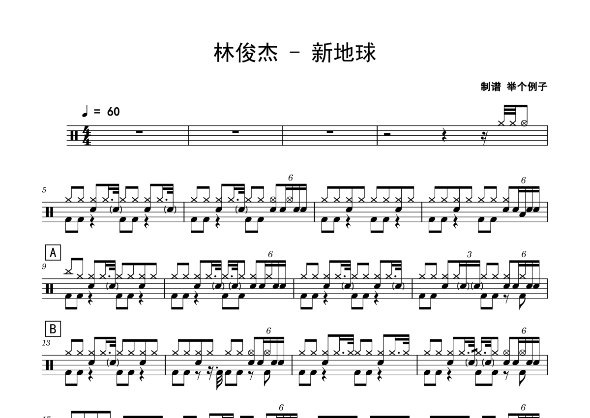 《新地球》是林俊杰演唱的一首歌曲,拍号为4/4拍,歌曲速度为每分钟60拍,这份鼓谱共有两张高清图谱,图谱由 @老虎不说谎 编配上传,图谱使用五线谱编配,使用这份新地球架子鼓谱,你将能够轻松地敲打出这首林俊杰的新地球,快来尝试吧。