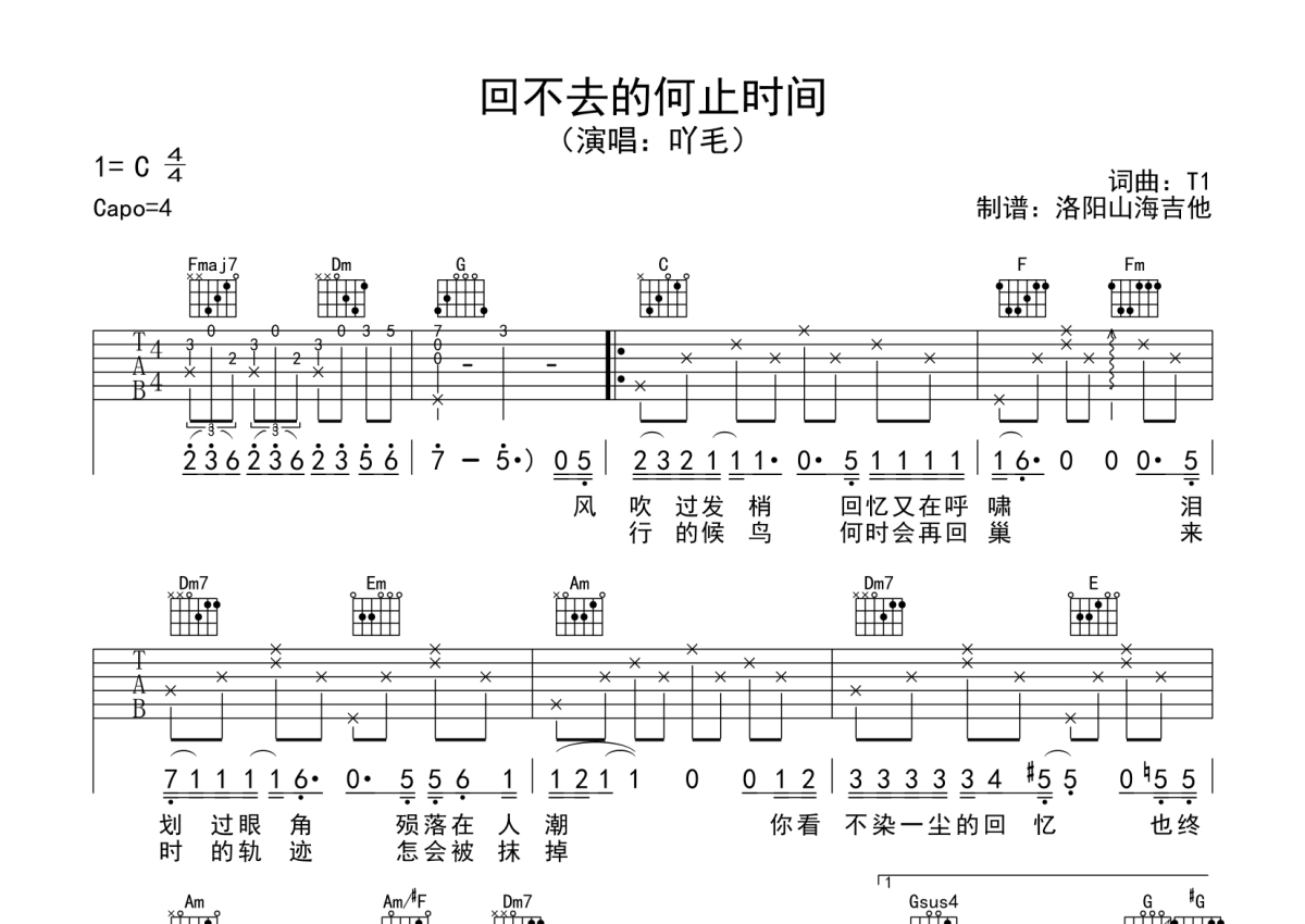 吖毛《回不去的何止时间》吉他谱 - C调弹唱六线谱