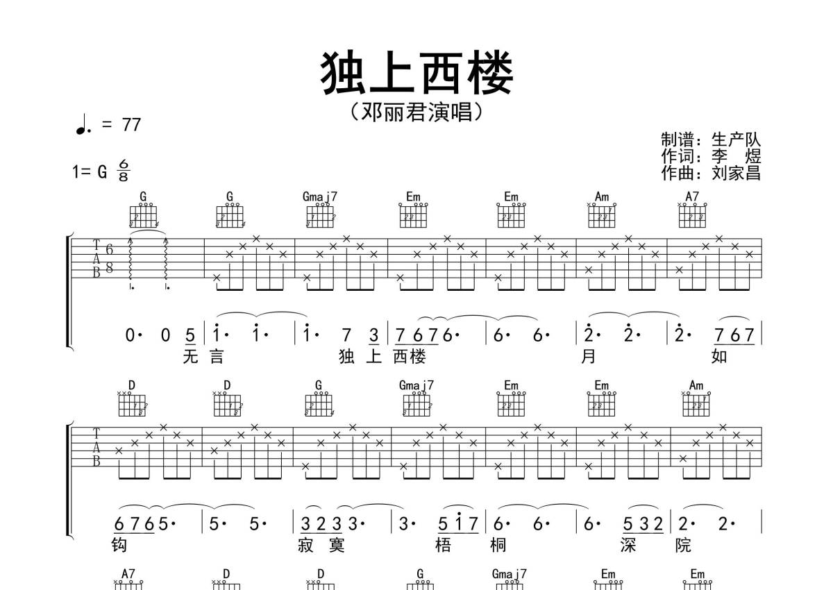 《独上西楼》是邓丽君演唱的一首歌曲,精编民谣版,拍号为6/8拍,歌曲速度为每分钟77拍,歌曲原调为G调,本吉他谱采用的是G调指法编配,演奏时不需要使用变调夹即为原调,这份吉他谱共有两张高清图谱,图谱由 @生产队 编配上传,图谱使用六线谱编配,包含吉他和弦指法、简谱以及歌词部分,使用这份独上西楼吉他谱,可以让你更加方便地掌握这首歌曲的弹唱技巧,快来尝试吧。《独上西楼》是根据南唐后主李煜的词《相见欢·无言独上西楼》而创作的歌曲,由刘家昌谱曲,收录在邓丽君于1983年发行的古诗词专辑《淡淡幽情》中。本吉他谱根据原版G调指法编配,含间奏SOLO编配,非常适合吉他弹唱的精编民谣版本,怀旧经典!。