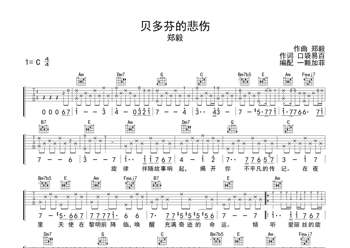 郑毅《贝多芬的悲伤》吉他谱 - C调弹唱六线谱