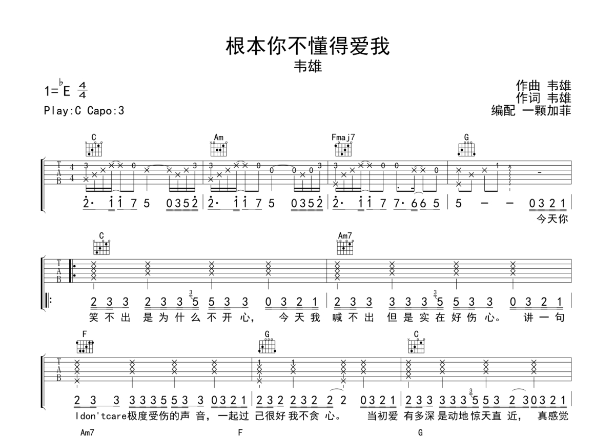 韦雄《根本你不懂得爱我》吉他谱 - C调弹唱六线谱