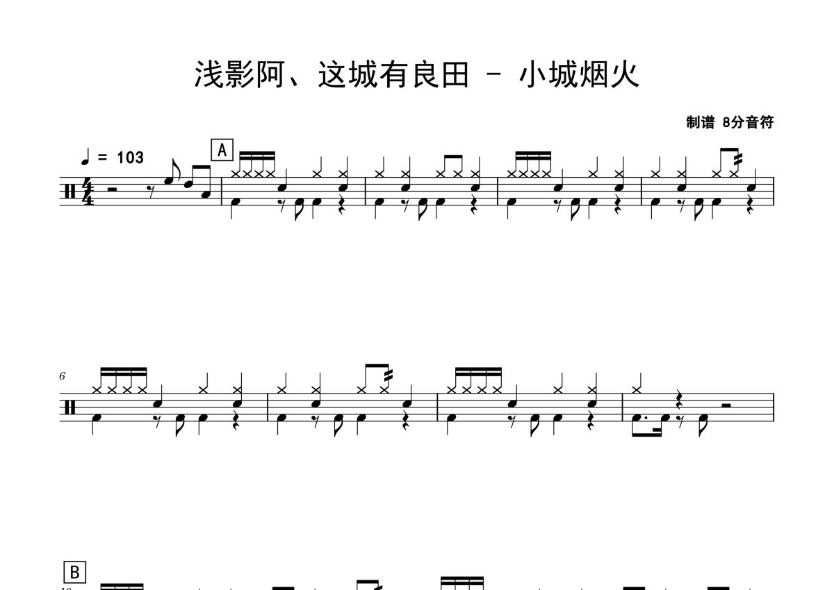 《小城烟火》是浅影阿、这城有良田演唱的一首歌曲,拍号为4/4拍,歌曲速度为每分钟103拍,这份鼓谱共有两张高清图谱,图谱由 @老虎不说谎 编配上传,图谱使用五线谱编配,使用这份小城烟火架子鼓谱,你将能够轻松地敲打出这首浅影阿、这城有良田的小城烟火,快来尝试吧。