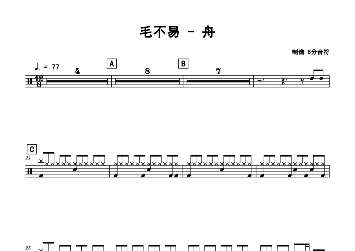 《舟》是毛不易演唱的一首歌曲,拍号为4/4拍,歌曲速度为每分钟77拍,这份鼓谱共有两张高清图谱,图谱由 @老虎不说谎 编配上传,图谱使用五线谱编配,使用这份舟架子鼓谱,你将能够轻松地敲打出这首毛不易的舟,快来尝试吧。