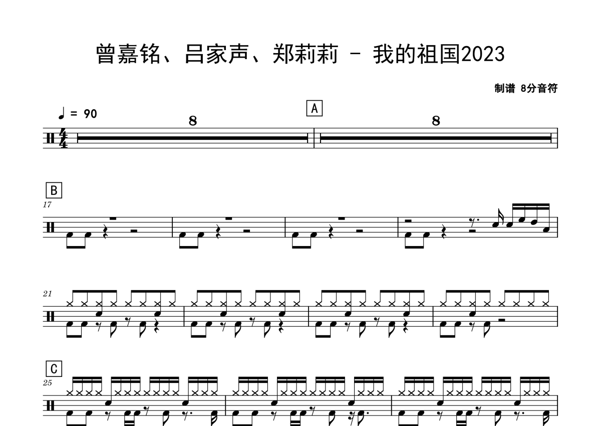 曾嘉铭、吕家声、郑莉莉《我的祖国2023》鼓谱 - 架子鼓谱