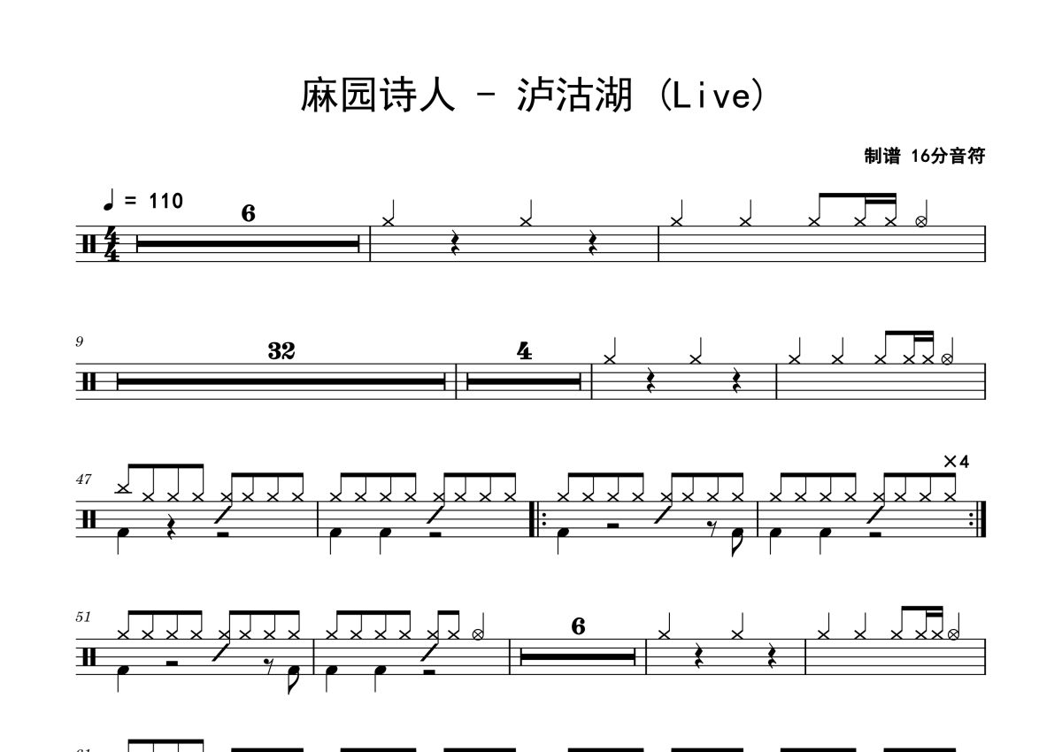 麻园诗人《泸沽湖》鼓谱 - 架子鼓谱 - Live