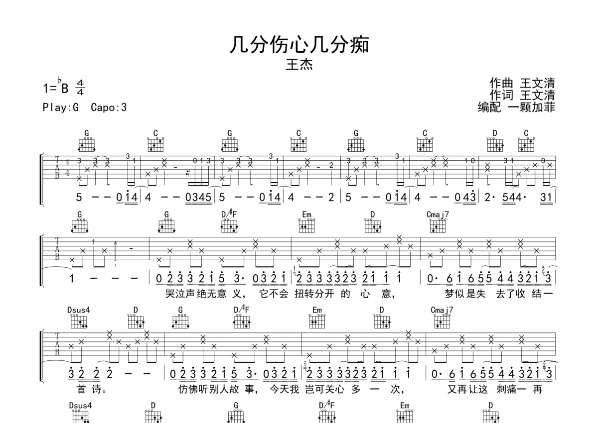 《几分伤心几分痴》是王杰演唱的一首歌曲,拍号为4/4拍,歌曲原调为Bb调,但由于原调指法比较难,为了方便弹奏,本吉他谱采用的是G调指法编配,变调夹3品弹奏即为原调,当然也可以根据自己的音域改变变调夹位置,或者通过改变和弦调性,以方便自己弹奏,这份吉他谱共有两张高清图谱,图谱由 @一颗加菲 编配上传,图谱使用六线谱编配,包含吉他和弦指法、简谱以及歌词部分,曲谱配备了相关的音频提供试听,使用这份几分伤心几分痴吉他谱,可以让你更加方便地掌握这首歌曲的弹唱技巧,快来尝试吧。