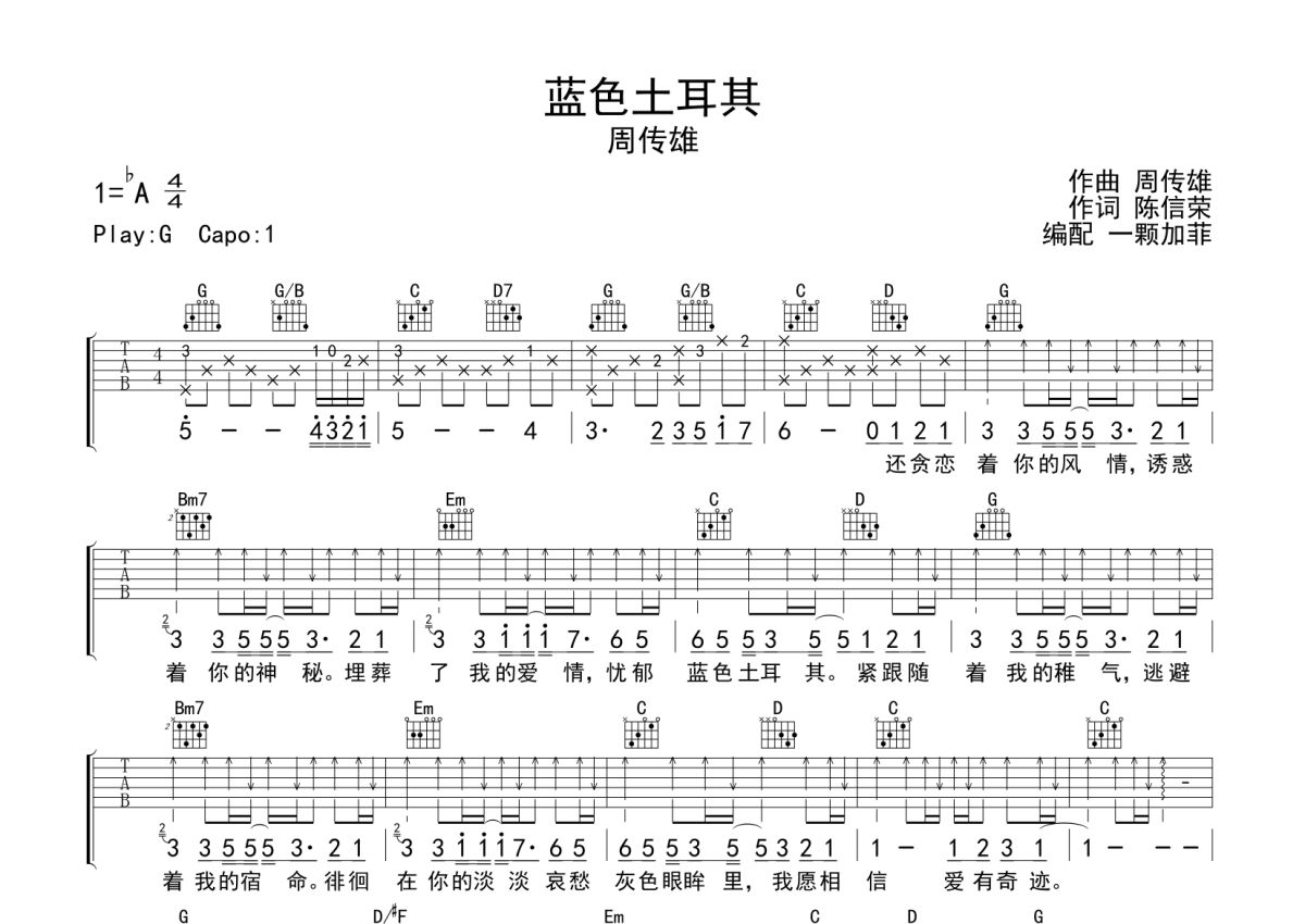 《蓝色土耳其》是周传雄演唱的一首歌曲,拍号为4/4拍,歌曲原调为Ab调,但由于原调指法比较难,为了方便弹奏,本吉他谱采用的是G调指法编配,变调夹1品弹奏即为原调,当然也可以根据自己的音域改变变调夹位置,或者通过改变和弦调性,以方便自己弹奏,这份吉他谱共有两张高清图谱,图谱由 @一颗加菲 编配上传,图谱使用六线谱编配,包含吉他和弦指法、简谱以及歌词部分,曲谱配备了相关的音频提供试听,使用这份蓝色土耳其吉他谱,可以让你更加方便地掌握这首歌曲的弹唱技巧,快来尝试吧。