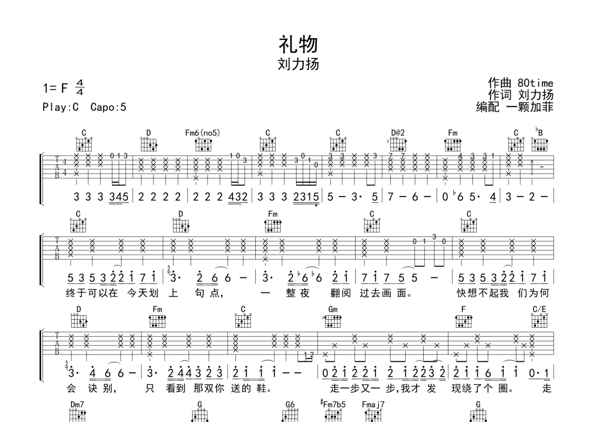 刘力扬《礼物》吉他谱 - C调弹唱六线谱