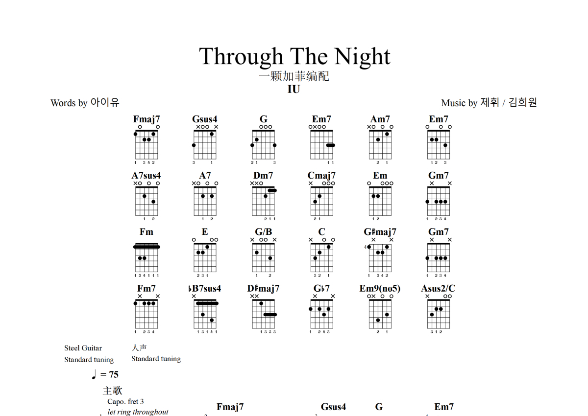 《Through The Night(夜信)》是IU(李知恩)演唱的一首歌曲,拍号为4/4拍,歌曲速度为每分钟75拍,本吉他谱采用的是C调指法编配,这份吉他谱共有四张高清图谱,图谱由 @一颗加菲 编配上传,图谱使用六线谱编配,包含吉他和弦指法、简谱以及歌词部分,曲谱配备了相关的音频提供试听,使用这份Through The Night(夜信)吉他谱,可以让你更加方便地掌握这首歌曲的弹唱技巧,快来尝试吧。