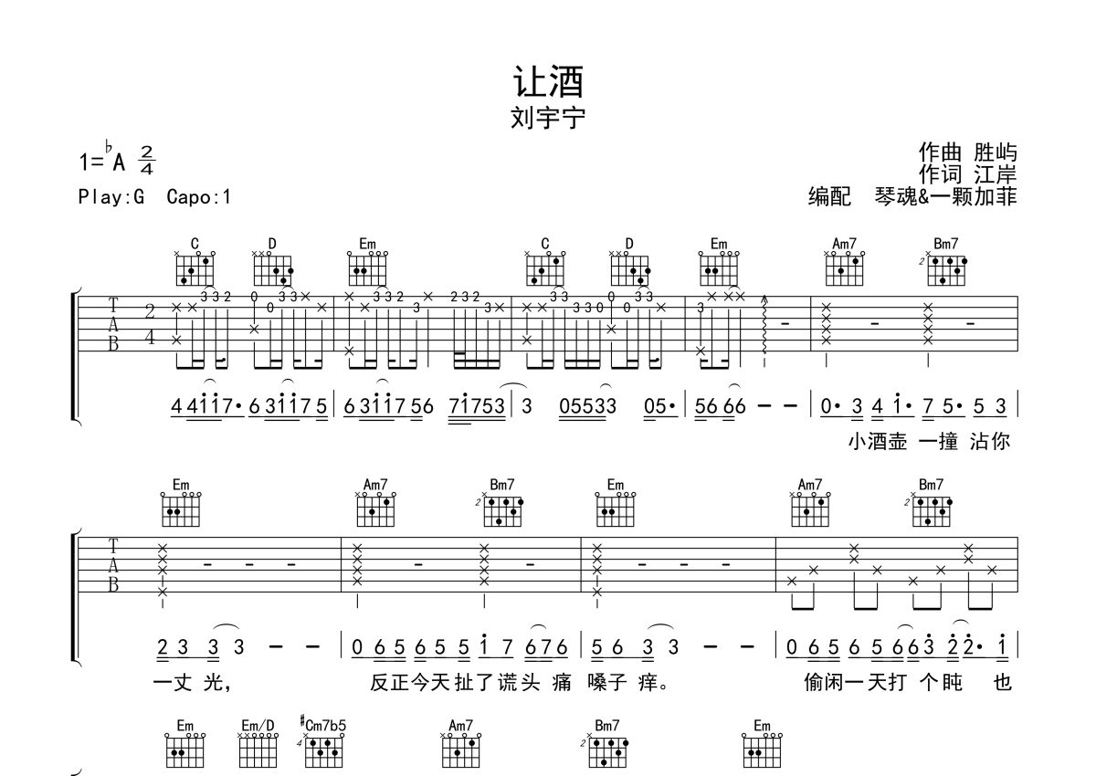 刘宇宁《让酒》吉他谱 - G调弹唱六线谱
