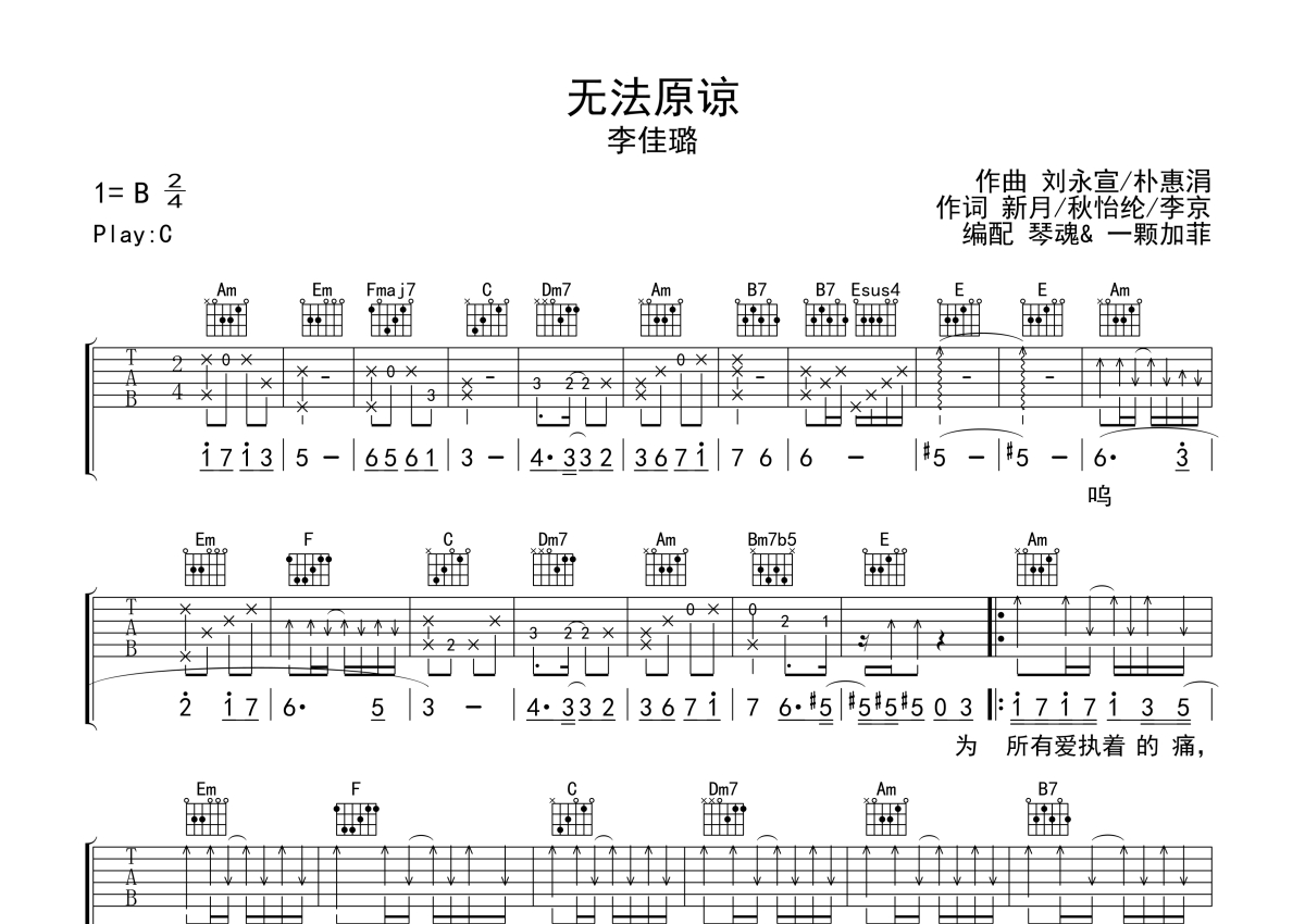 《无法原谅》是李佳璐演唱的一首歌曲,拍号为2/4拍,歌曲原调为B调,但由于原调指法比较难,为了方便弹奏,本吉他谱采用的是C调指法编配,降半音调弦弹奏即为原调,当然也可以根据自己的音域决定是否调弦,这份吉他谱共有三张高清图谱,图谱由 @一颗加菲 编配上传,图谱使用六线谱编配,包含吉他和弦指法、简谱以及歌词部分,曲谱配备了相关的音频提供试听,使用这份无法原谅吉他谱,可以让你更加方便地掌握这首歌曲的弹唱技巧,快来尝试吧。