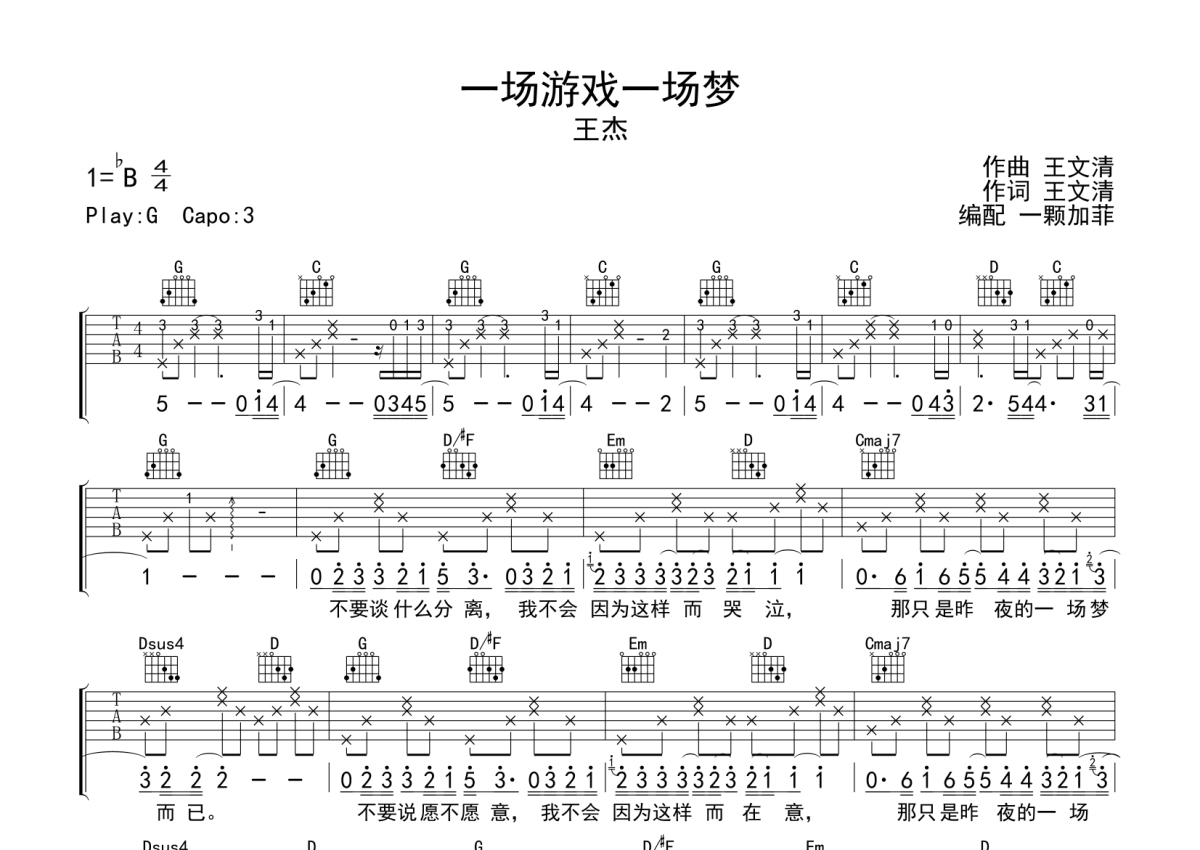《一场游戏一场梦》是王杰演唱的一首歌曲,拍号为4/4拍,歌曲原调为Bb调,但由于原调指法比较难,为了方便弹奏,本吉他谱采用的是G调指法编配,变调夹3品弹奏即为原调,当然也可以根据自己的音域改变变调夹位置,或者通过改变和弦调性,以方便自己弹奏,这份吉他谱共有两张高清图谱,图谱由 @一颗加菲 编配上传,图谱使用六线谱编配,包含吉他和弦指法、简谱以及歌词部分,曲谱配备了相关的音频提供试听,使用这份一场游戏一场梦吉他谱,可以让你更加方便地掌握这首歌曲的弹唱技巧,快来尝试吧。
