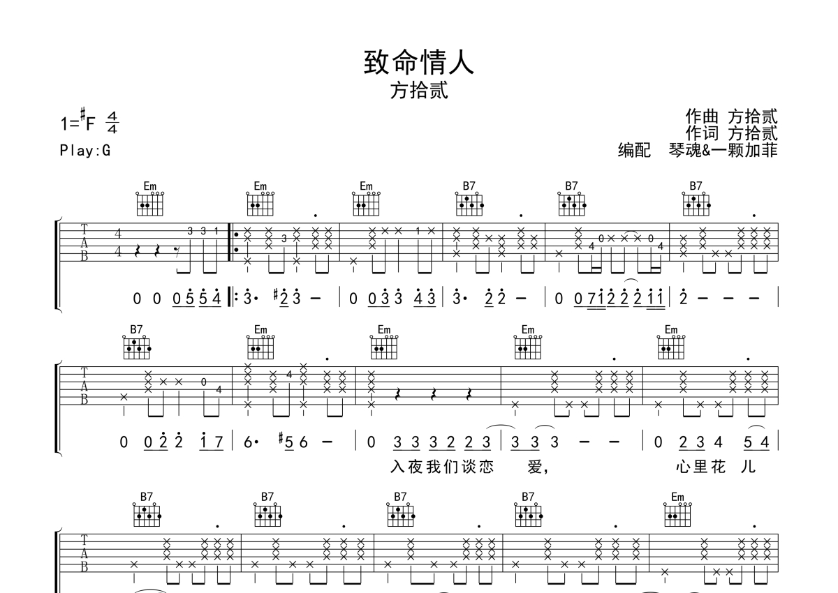 方拾贰《致命情人》吉他谱 - G调弹唱六线谱