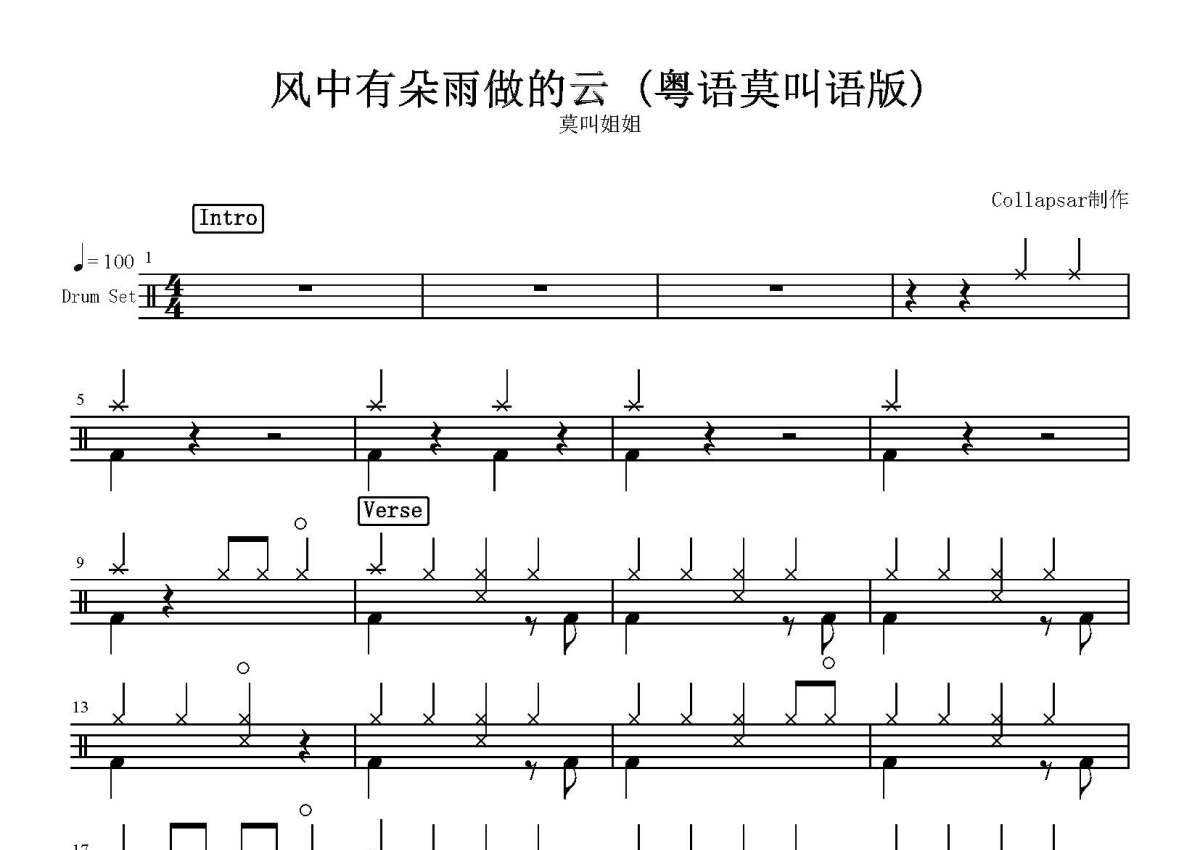 莫叫姐姐《风中有朵雨做的云》鼓谱 - 架子鼓谱 - 粤语莫叫语版