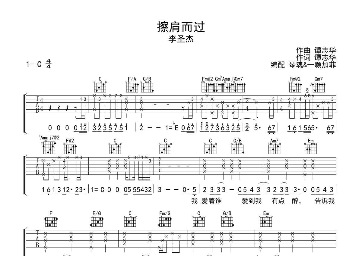 《擦肩而过》是李圣杰演唱的一首歌曲,拍号为4/4拍,本吉他谱采用的是C调指法编配,这份吉他谱共有三张高清图谱,图谱由 @一颗加菲 编配上传,图谱使用六线谱编配,包含吉他和弦指法、简谱以及歌词部分,曲谱配备了相关的音频提供试听,使用这份擦肩而过吉他谱,可以让你更加方便地掌握这首歌曲的弹唱技巧,快来尝试吧。