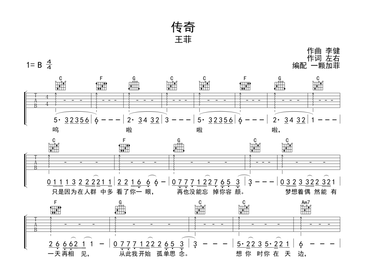 《传奇》是李健演唱的一首歌曲,拍号为4/4拍,歌曲原调为B调,但由于原调指法比较难,为了方便弹奏,本吉他谱采用的是C调指法编配,降半音调弦弹奏即为原调,当然也可以根据自己的音域决定是否调弦,这份吉他谱共有两张高清图谱,图谱由 @一颗加菲 编配上传,图谱使用六线谱编配,包含吉他和弦指法、简谱以及歌词部分,曲谱配备了相关的音频提供试听,使用这份传奇吉他谱,可以让你更加方便地掌握这首歌曲的弹唱技巧,快来尝试吧。