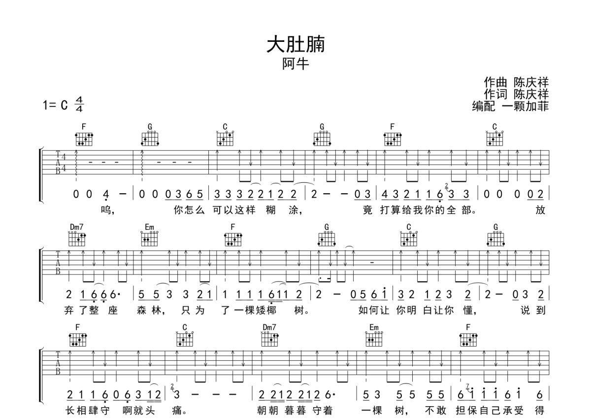 阿牛《大肚腩》吉他谱 - C调弹唱六线谱