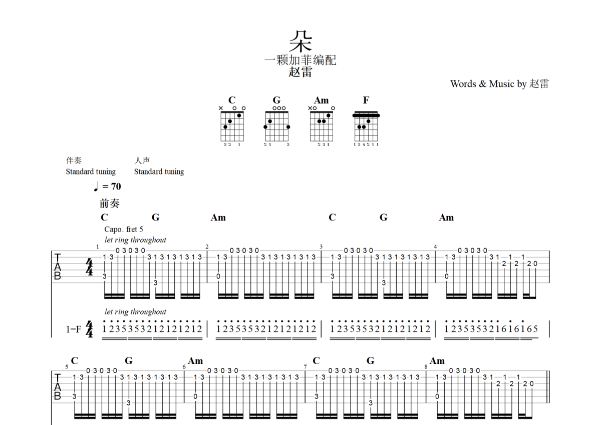 赵雷《朵》吉他谱 - C调弹唱六线谱