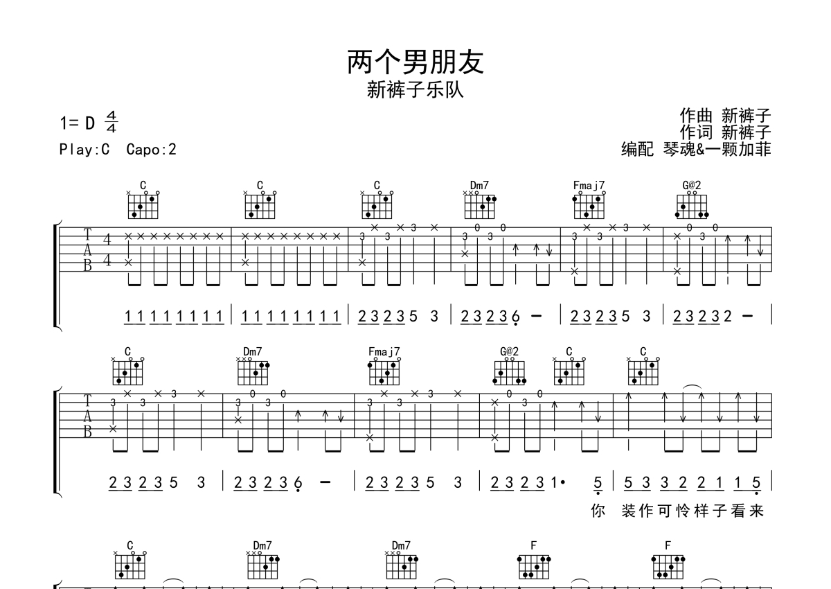 《两个男朋友》是新裤子乐队演唱的一首歌曲,拍号为4/4拍,歌曲原调为D调,但由于原调指法比较难,为了方便弹奏,本吉他谱采用的是C调指法编配,变调夹2品弹奏即为原调,当然也可以根据自己的音域改变变调夹位置,或者通过改变和弦调性,以方便自己弹奏,这份吉他谱共有四张高清图谱,图谱由 @一颗加菲 编配上传,图谱使用六线谱编配,包含吉他和弦指法、简谱以及歌词部分,曲谱配备了相关的音频提供试听,使用这份两个男朋友吉他谱,可以让你更加方便地掌握这首歌曲的弹唱技巧,快来尝试吧。
