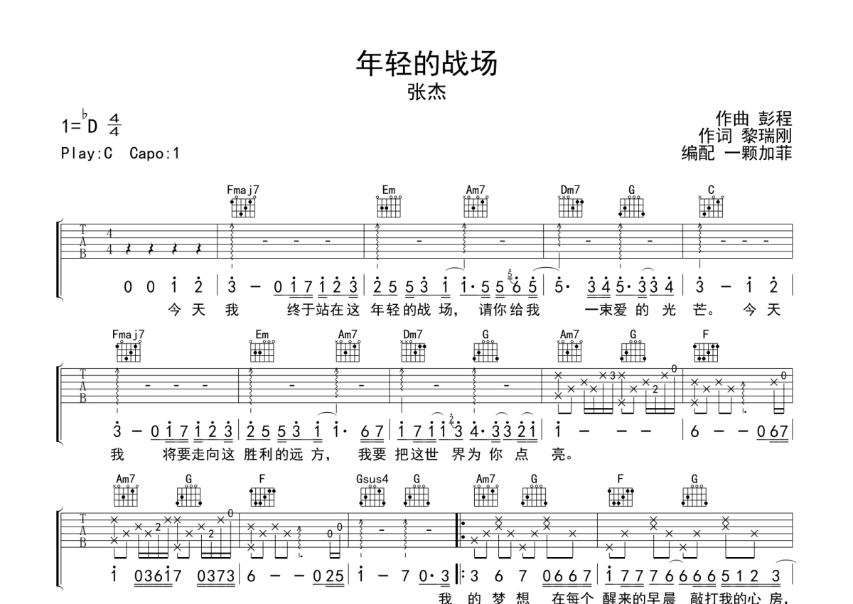 张杰《年轻的战场》吉他谱 - C调弹唱六线谱