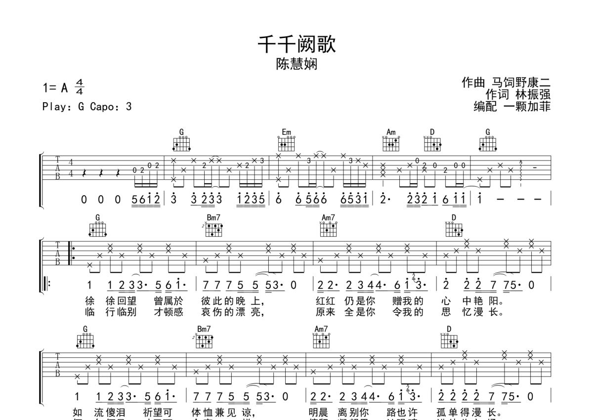 陈慧娴《千千阙歌》吉他谱 - G调弹唱六线谱