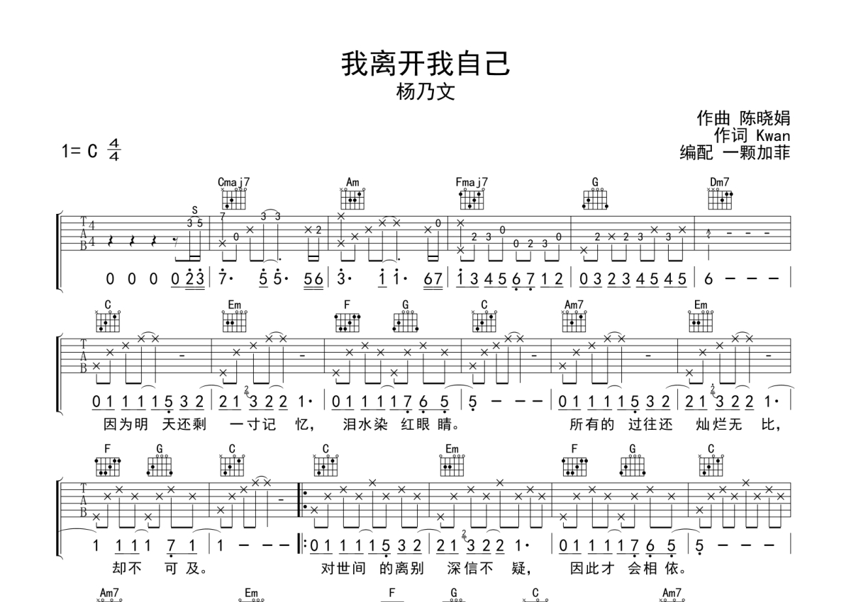 杨乃文《我离开我自己》吉他谱 - C调弹唱六线谱
