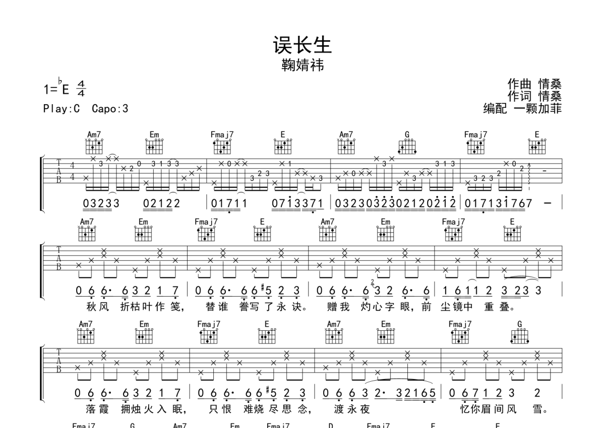 《误长生》是鞠婧祎演唱的一首歌曲,拍号为4/4拍,歌曲原调为Eb调,但由于原调指法比较难,为了方便弹奏,本吉他谱采用的是C调指法编配,变调夹3品弹奏即为原调,当然也可以根据自己的音域改变变调夹位置,或者通过改变和弦调性,以方便自己弹奏,这份吉他谱共有两张高清图谱,图谱由 @一颗加菲 编配上传,图谱使用六线谱编配,包含吉他和弦指法、简谱以及歌词部分,曲谱配备了相关的音频提供试听,使用这份误长生吉他谱,可以让你更加方便地掌握这首歌曲的弹唱技巧,快来尝试吧。