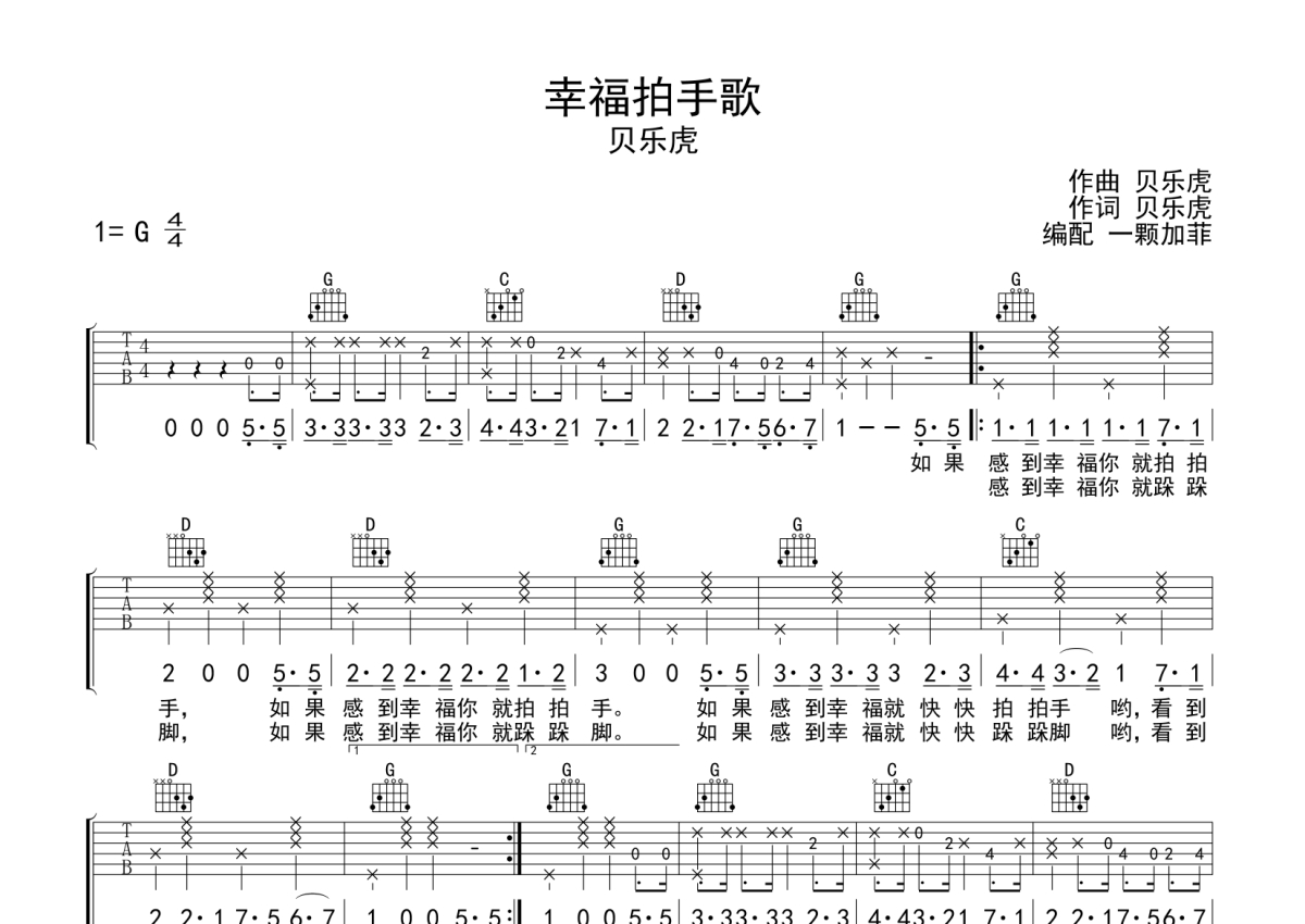 《幸福拍手歌》是贝乐虎儿歌演唱的一首歌曲,拍号为4/4拍,本吉他谱采用的是G调指法编配,这份吉他谱共有一张高清图谱,图谱由 @一颗加菲 编配上传,图谱使用六线谱编配,包含吉他和弦指法、简谱以及歌词部分,曲谱配备了相关的音频提供试听,使用这份幸福拍手歌吉他谱,可以让你更加方便地掌握这首歌曲的弹唱技巧,快来尝试吧。