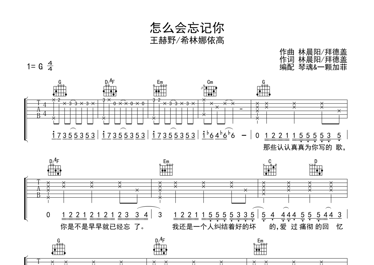 王赫野/希林娜依高《怎么会忘记你》吉他谱 - G调弹唱六线谱