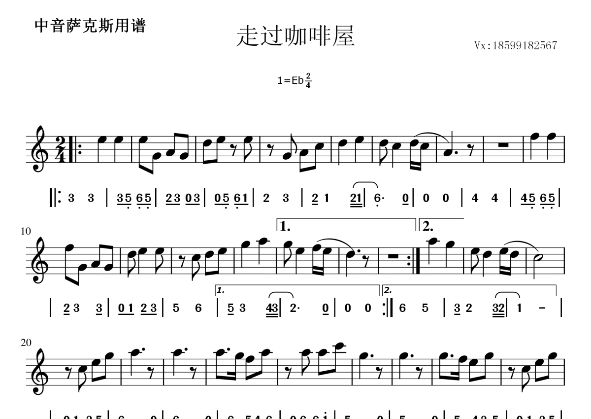 《走过咖啡屋》是千百惠演唱的一首歌曲,中音五线谱,拍号为2/4拍,这份萨克斯谱共有一张高清图谱,图谱由 @鹤大鹤 编配上传中音萨克斯用五线谱。