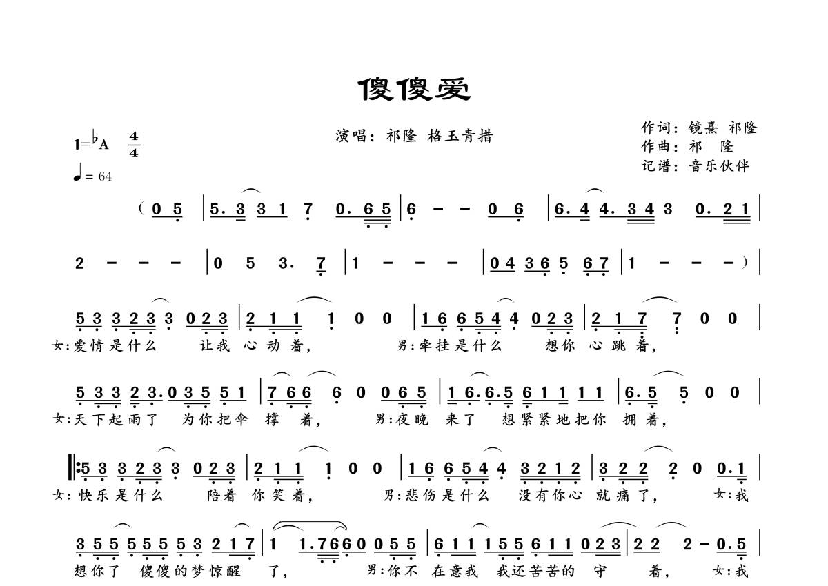 祁隆/格玉青措《傻傻爱》简谱