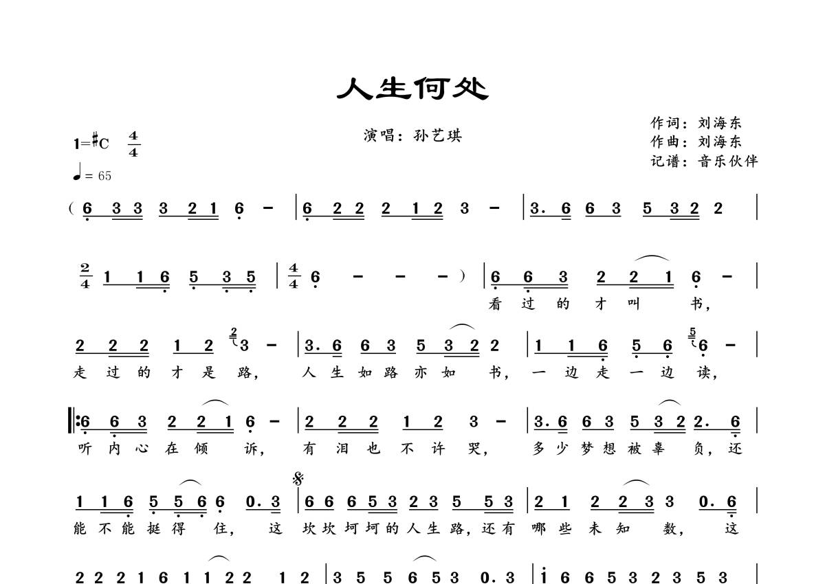 《人生何处》是孙艺琪演唱的一首歌曲,拍号为4/4拍,歌曲速度为每分钟65拍,这份简谱共有一张高清图谱,图谱由 @音乐伙伴 编配上传。