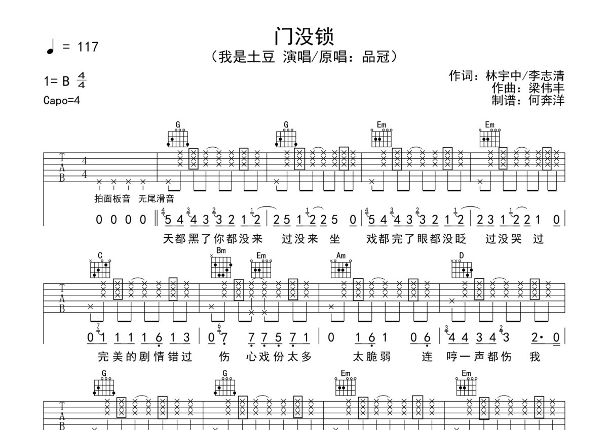 我是土豆《门没锁》吉他谱 - G调弹唱六线谱