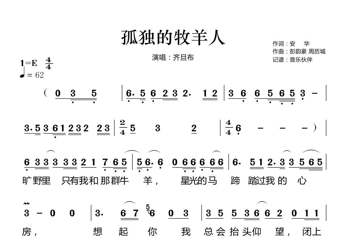 《孤独的牧羊人》是齐旦布演唱的一首歌曲,这份简谱共有两张高清图谱,图谱由 @音乐伙伴 编配上传。