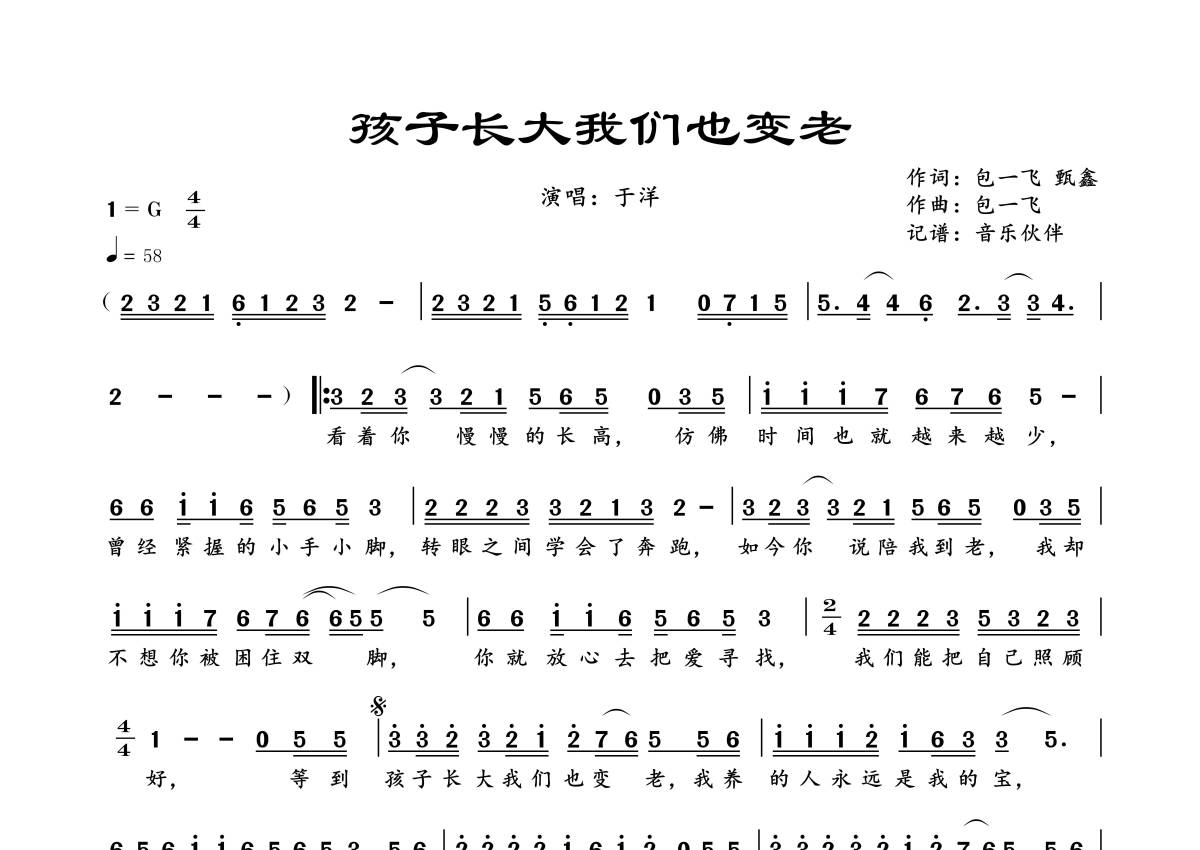 《孩子长大我们也变老》是于洋演唱的一首歌曲,拍号为4/4拍,这份简谱共有一张高清图谱,图谱由 @音乐伙伴 编配上传。