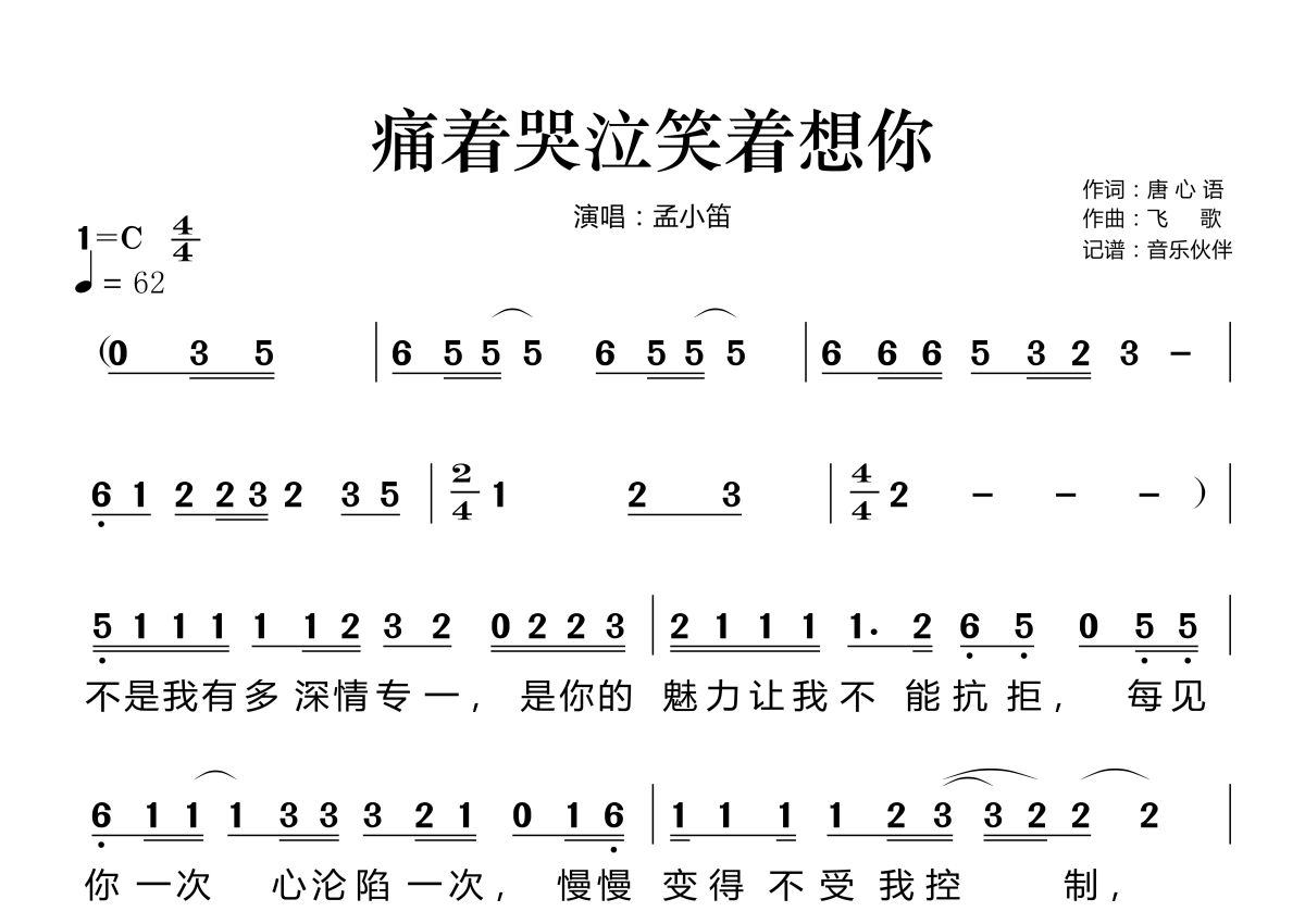 《痛着哭泣笑着想你》是孟小笛演唱的一首歌曲,拍号为4/4拍,歌曲速度为每分钟62拍,这份简谱共有两张高清图谱,图谱由 @音乐伙伴 编配上传。