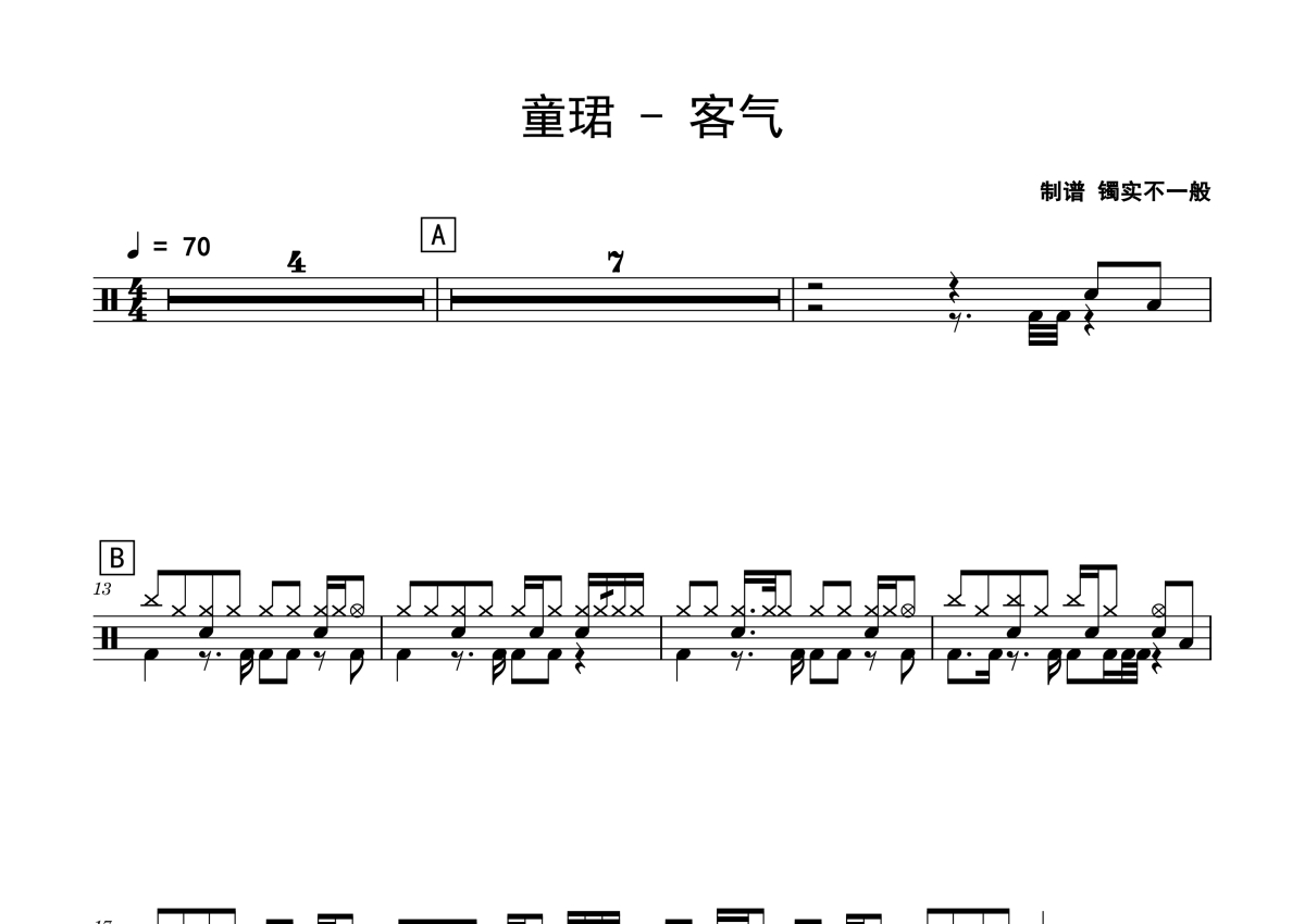《客气》是童珺演唱的一首歌曲,拍号为4/4拍,歌曲速度为每分钟70拍,这份鼓谱共有两张高清图谱,图谱由 @老虎不说谎 编配上传,图谱使用五线谱编配,使用这份客气架子鼓谱,你将能够轻松地敲打出这首童珺的客气,快来尝试吧。