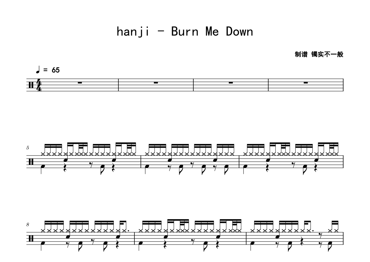 《Burn Me Down》是hanji演唱的一首歌曲,拍号为4/4拍,歌曲速度为每分钟65拍,这份鼓谱共有两张高清图谱,图谱由 @老虎不说谎 编配上传,图谱使用五线谱编配,使用这份Burn Me Down架子鼓谱,你将能够轻松地敲打出这首hanji的Burn Me Down,快来尝试吧。