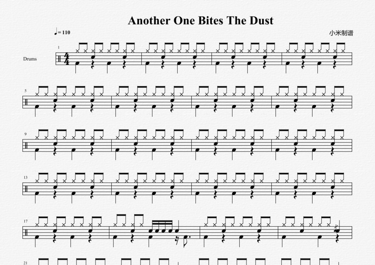 《Another One Bites The Dust》是Queen演唱的一首歌曲,拍号为4/4拍,歌曲速度为每分钟110拍,这份鼓谱共有三张高清图谱,图谱由 @小米鼓谱 编配上传,图谱使用五线谱编配,使用这份Another One Bites The Dust架子鼓谱,你将能够轻松地敲打出这首Queen的Another One Bites The Dust,快来尝试吧。