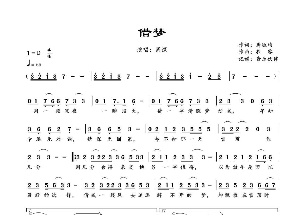 《借梦》是周深演唱的一首歌曲,拍号为4/4拍,歌曲速度为每分钟65拍,这份简谱共有一张高清图谱,图谱由 @音乐伙伴 编配上传。