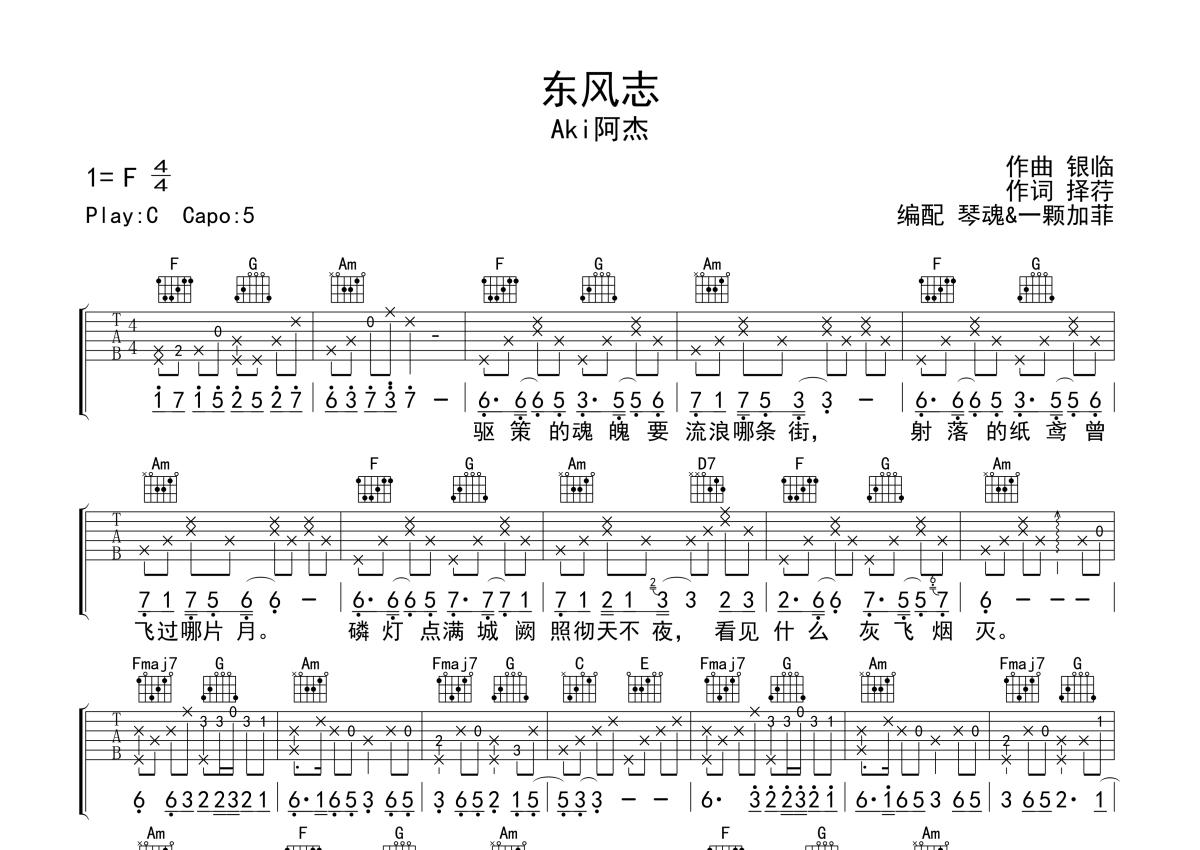 Aki阿杰《东风志》吉他谱 - C调弹唱六线谱