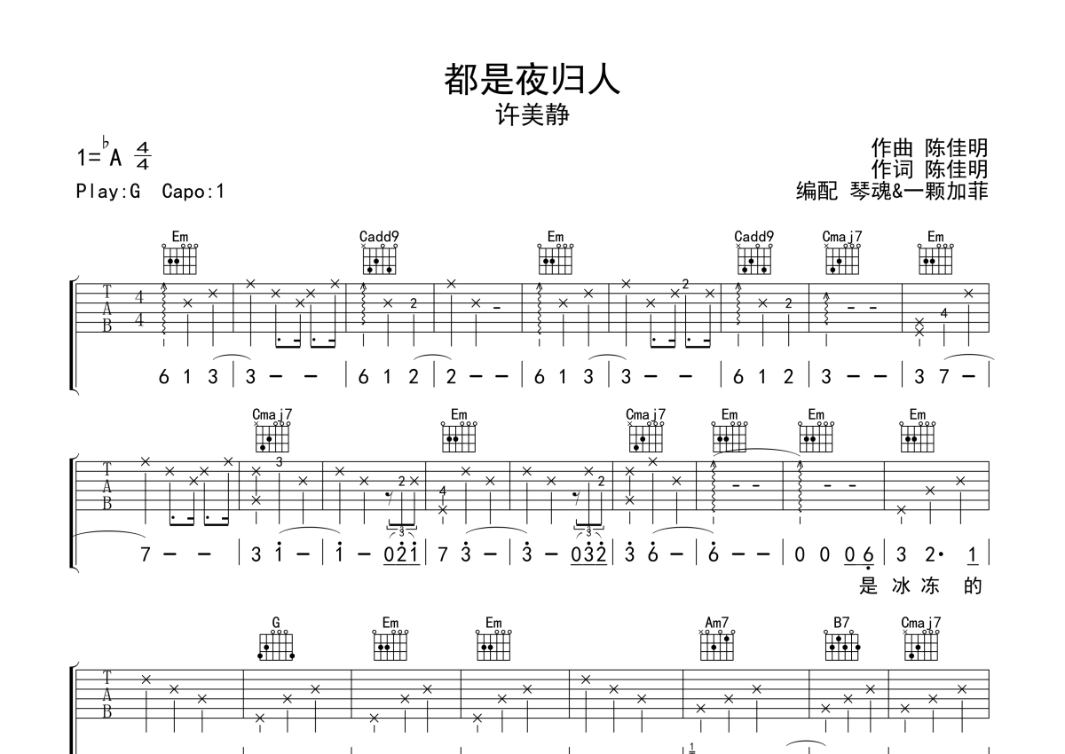 《都是夜归人》是许美静演唱的一首歌曲,拍号为4/4拍,歌曲原调为Ab调,但由于原调指法比较难,为了方便弹奏,本吉他谱采用的是G调指法编配,变调夹1品弹奏即为原调,当然也可以根据自己的音域改变变调夹位置,或者通过改变和弦调性,以方便自己弹奏,这份吉他谱共有三张高清图谱,图谱由 @一颗加菲 编配上传,图谱使用六线谱编配,包含吉他和弦指法、简谱以及歌词部分,曲谱配备了相关的音频提供试听,使用这份都是夜归人吉他谱,可以让你更加方便地掌握这首歌曲的弹唱技巧,快来尝试吧。