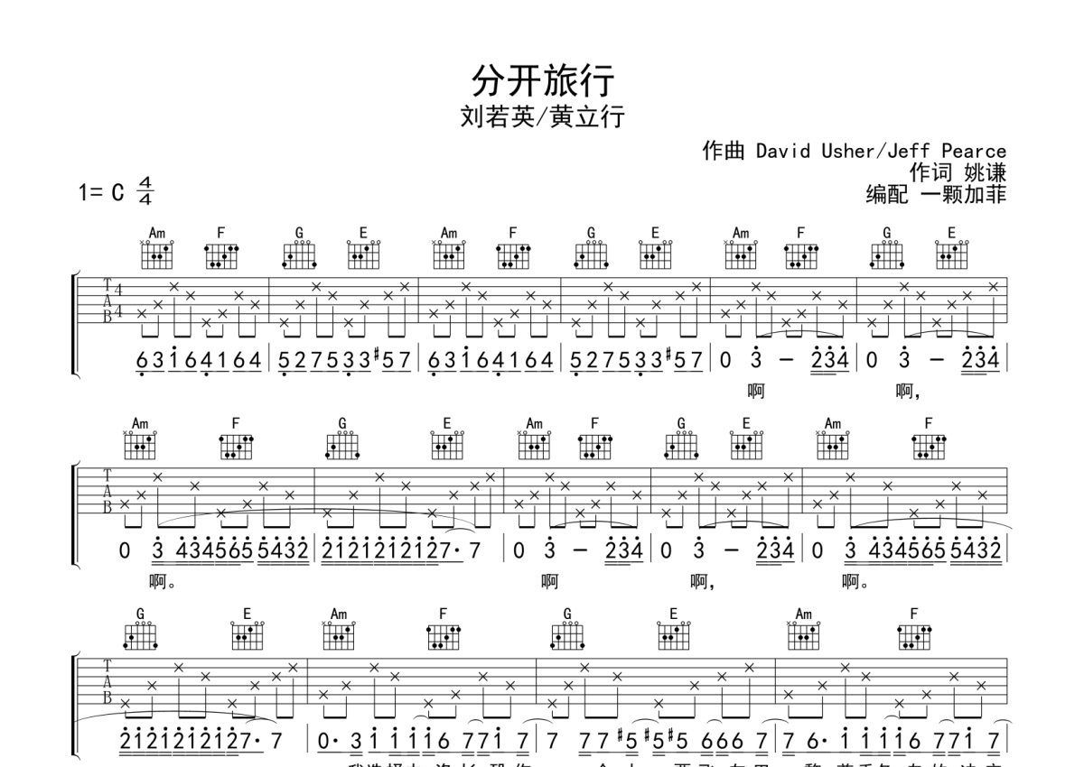 刘若英/黄立行《分开旅行》吉他谱 - C调弹唱六线谱