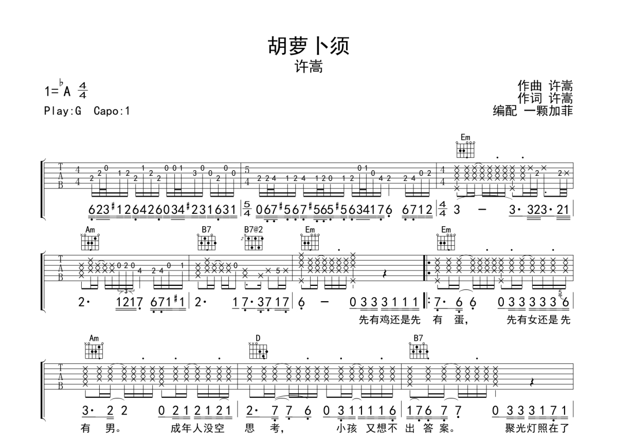 《胡萝卜须》是许嵩演唱的一首歌曲,拍号为4/4拍,歌曲原调为Ab调,但由于原调指法比较难,为了方便弹奏,本吉他谱采用的是G调指法编配,变调夹1品弹奏即为原调,当然也可以根据自己的音域改变变调夹位置,或者通过改变和弦调性,以方便自己弹奏,这份吉他谱共有两张高清图谱,图谱由 @一颗加菲 编配上传,图谱使用六线谱编配,包含吉他和弦指法、简谱以及歌词部分,曲谱配备了相关的音频提供试听,使用这份胡萝卜须吉他谱,可以让你更加方便地掌握这首歌曲的弹唱技巧,快来尝试吧。