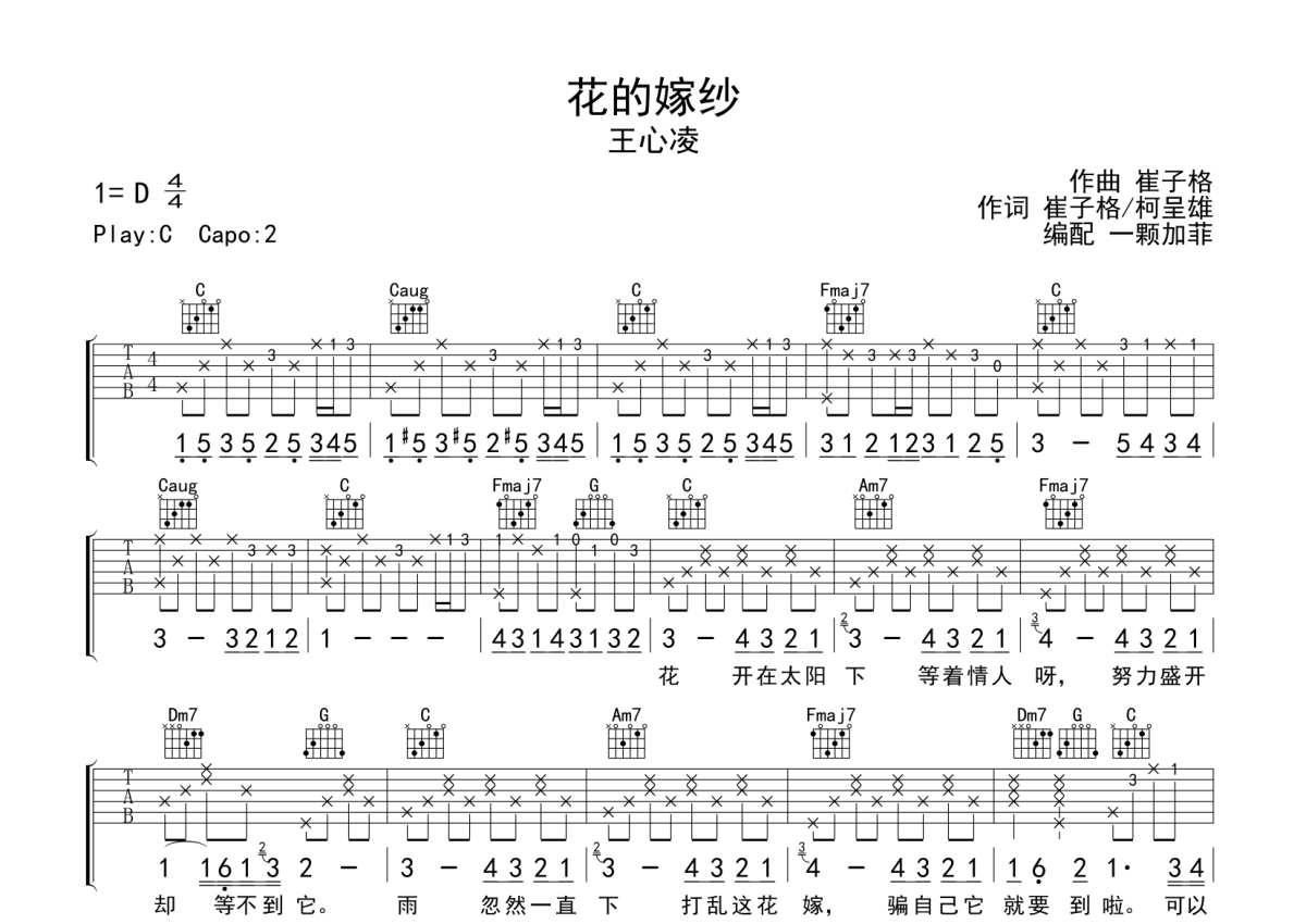 《花的嫁纱》是王心凌演唱的一首歌曲,拍号为4/4拍,歌曲原调为D调,但由于原调指法比较难,为了方便弹奏,本吉他谱采用的是C调指法编配,变调夹2品弹奏即为原调,当然也可以根据自己的音域改变变调夹位置,或者通过改变和弦调性,以方便自己弹奏,这份吉他谱共有两张高清图谱,图谱由 @一颗加菲 编配上传,图谱使用六线谱编配,包含吉他和弦指法、简谱以及歌词部分,曲谱配备了相关的音频提供试听,使用这份花的嫁纱吉他谱,可以让你更加方便地掌握这首歌曲的弹唱技巧,快来尝试吧。
